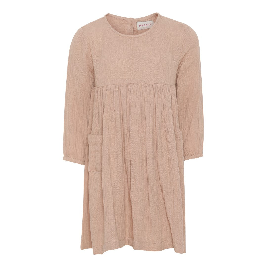 Classic girl's dress with ruching at the waist and long sleeves with elastic.