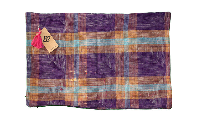 Our cushion cover a stitched from recycled cotton sari stitched from multiple layers of fabric stitched together with 'kantha' hand embroidery
