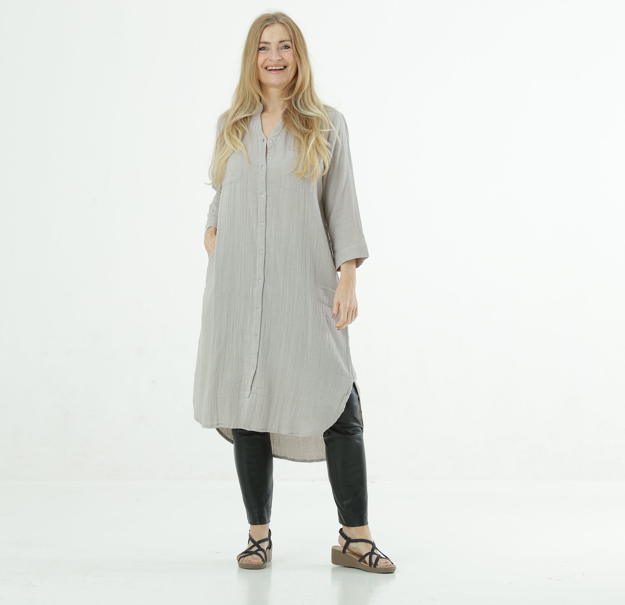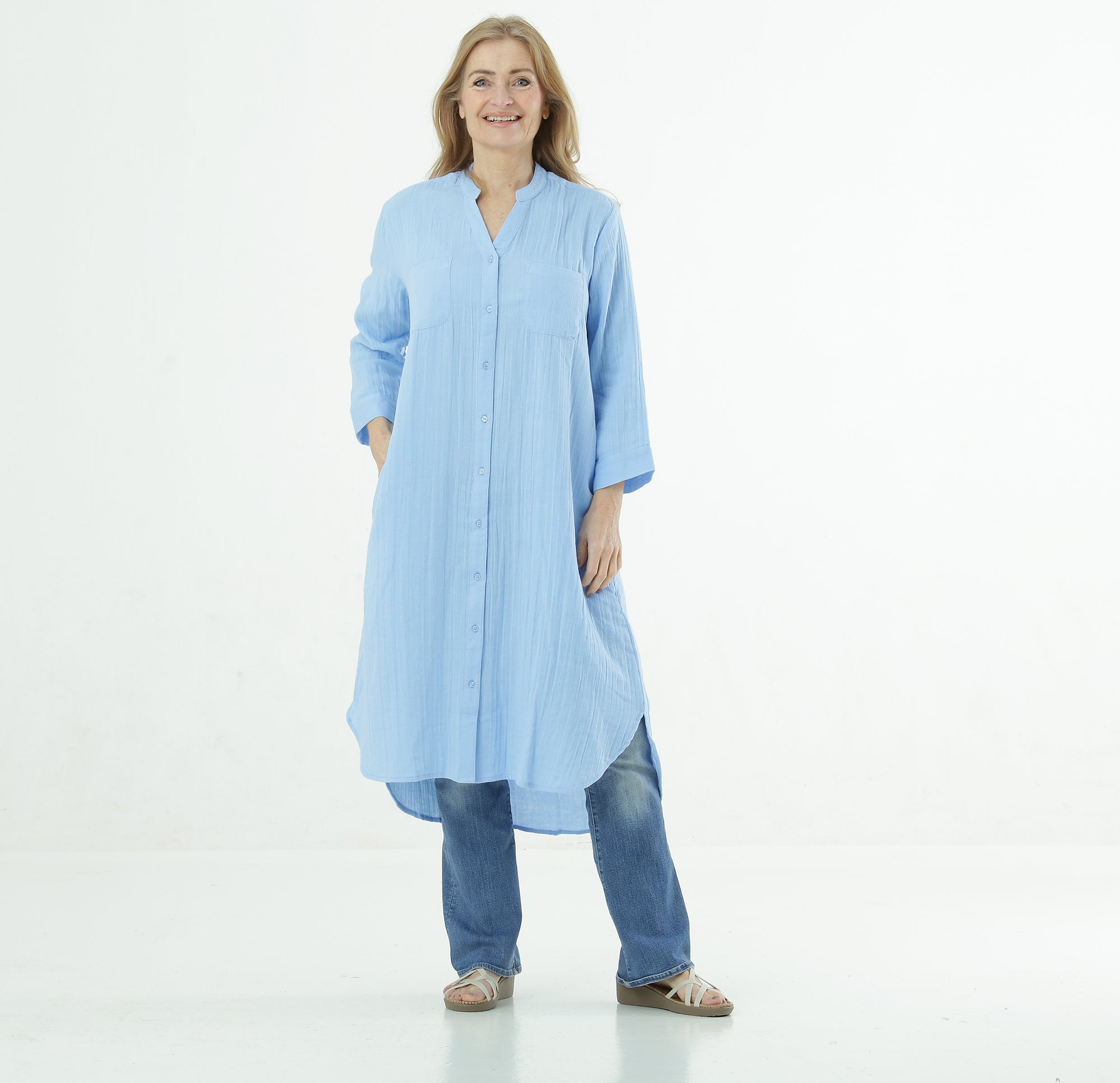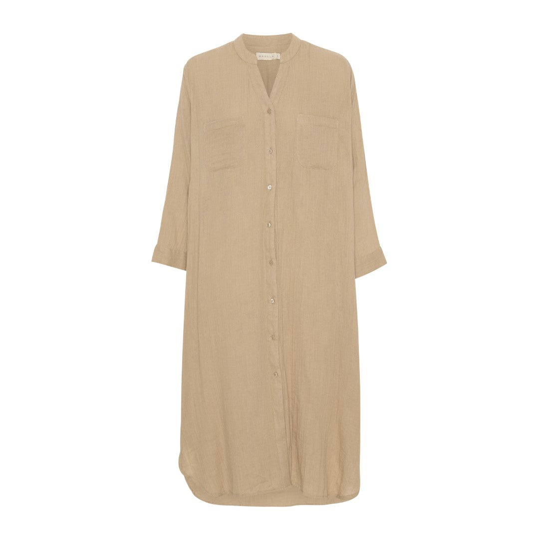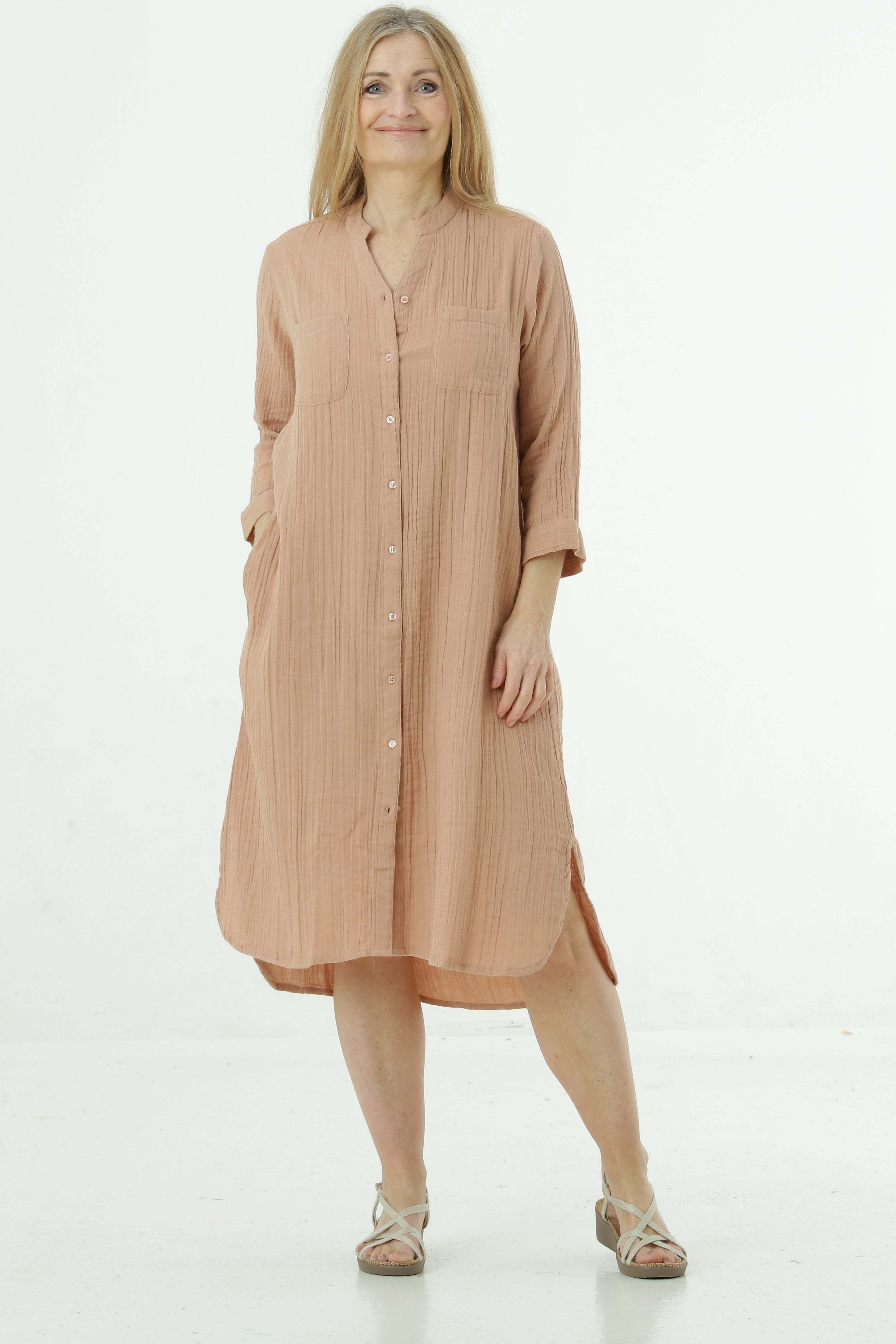 Lang gennemknappet skjortekjole med brystlommer og kinakrave.