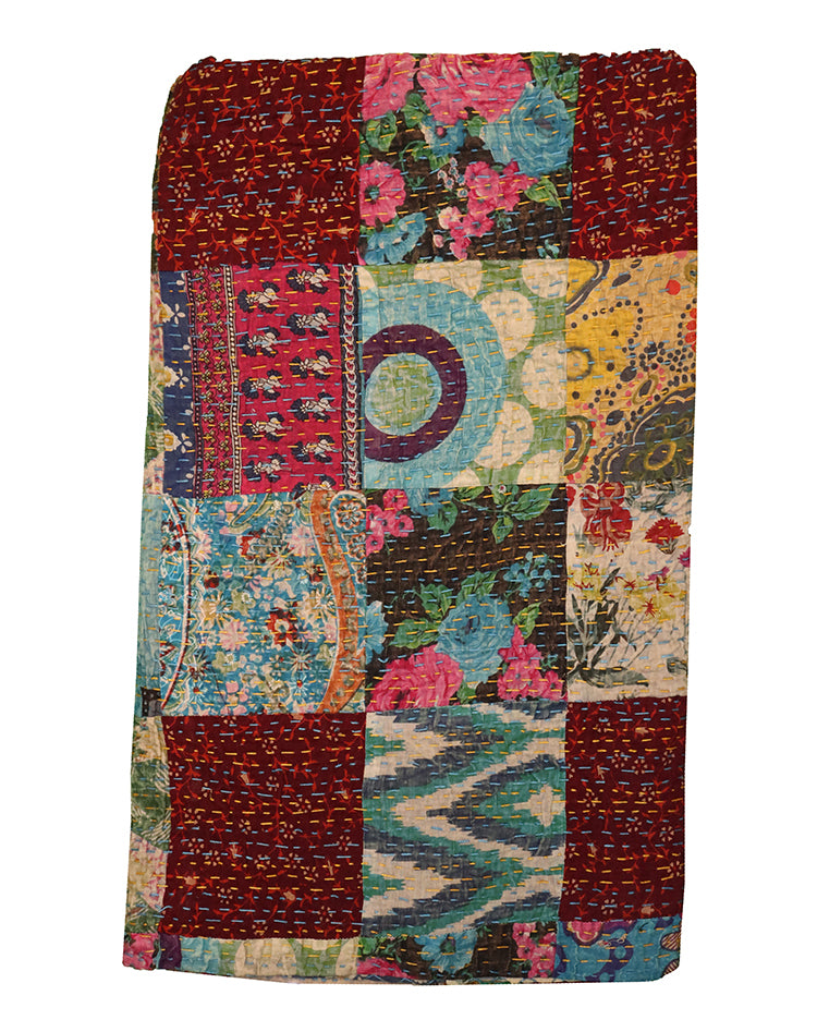 Materialet er patchwork syet af overskuds bomuldsstoffer og derefter håndbroderet med kantha.