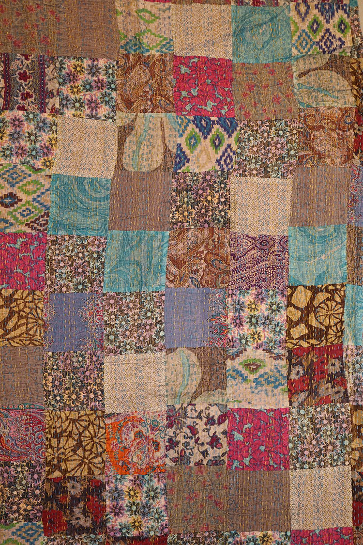 Materialet er patchwork syet af overskuds bomuldsstoffer og derefter håndbroderet med kantha.