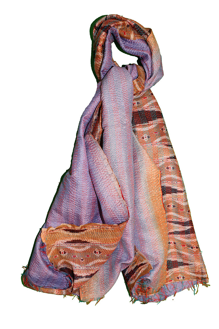 Disse farverige tørklæder er syet af vintage silkesarier, sammensat af flere forskellige stoffer i dobbelt lag og håndbroderet. Fantastiske farver, håndværk og tradition - hvert tørklæde sin historie