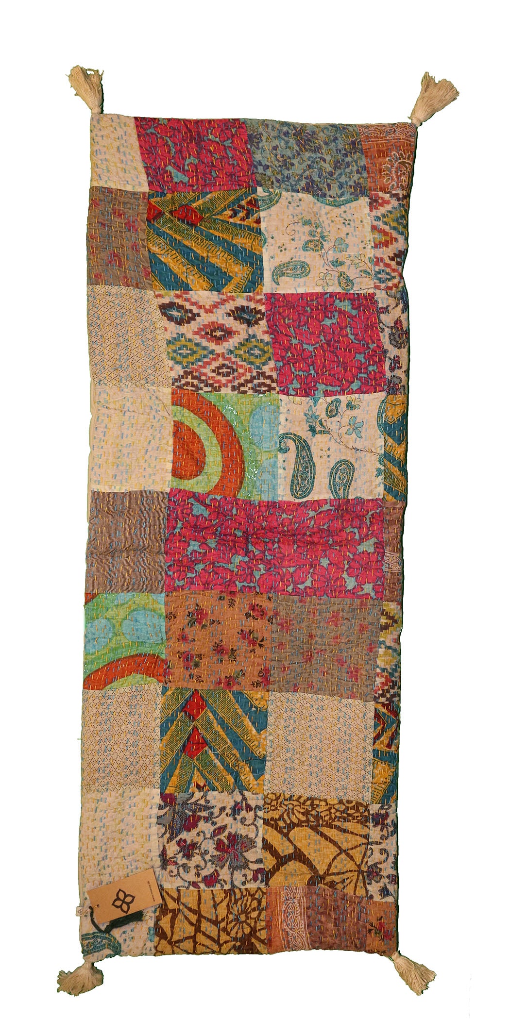 Vores patchwork hynder og madrasser er syet af overskuds bomuldsstoffer og derefter håndbroderet med kantha.