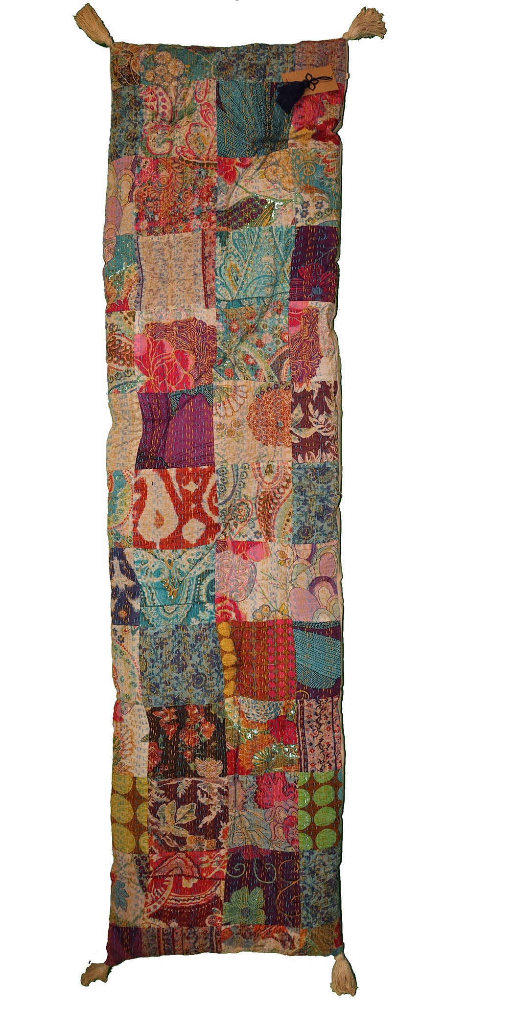 Vores patchwork hynder og madrasser er syet af overskuds bomuldsstoffer og derefter håndbroderet med kantha.