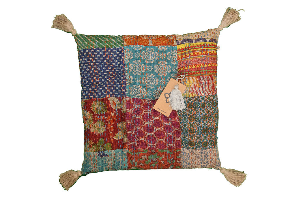 Vores patchwork hynder og madrasser er syet af overskuds bomuldsstoffer og derefter håndbroderet med kantha.