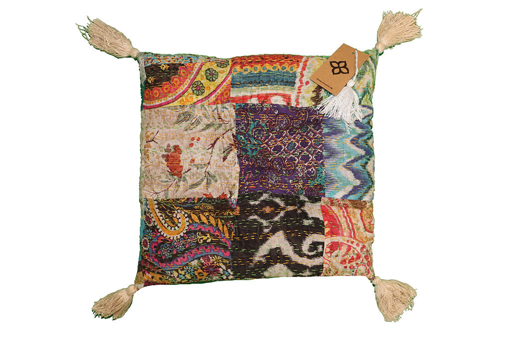 Vores patchwork hynder og madrasser er syet af overskuds bomuldsstoffer og derefter håndbroderet med kantha.