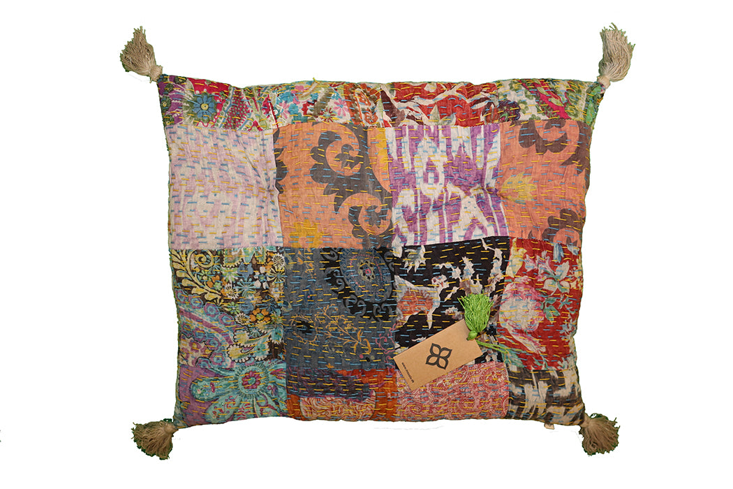 Vores patchwork hynder og madrasser er syet af overskuds bomuldsstoffer og derefter håndbroderet med kantha.