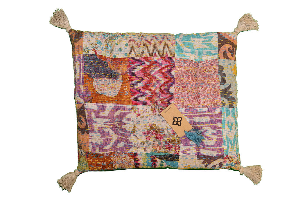 Vores patchwork hynder og madrasser er syet af overskuds bomuldsstoffer og derefter håndbroderet med kantha.