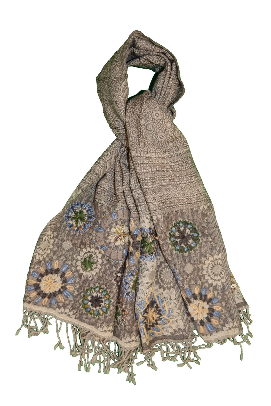 Elegant og farverigt uld tørklæde med broderinger, tørklædet er vævet af 100 % let kogt uld.
