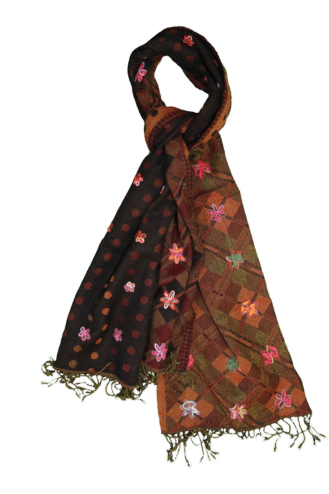 Elegant og farverigt uld tørklæde med broderinger, tørklædet er vævet af 100 % let kogt uld.