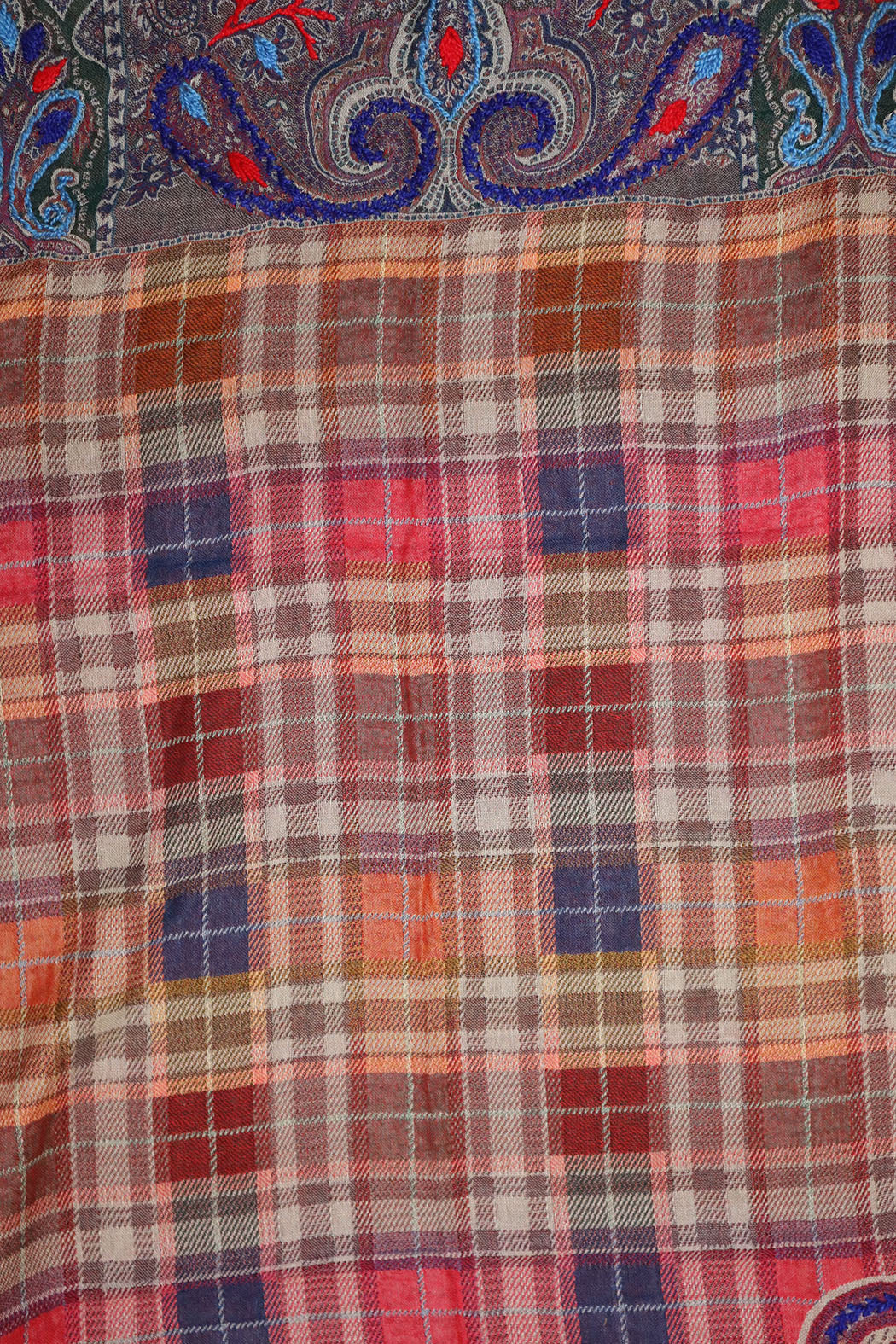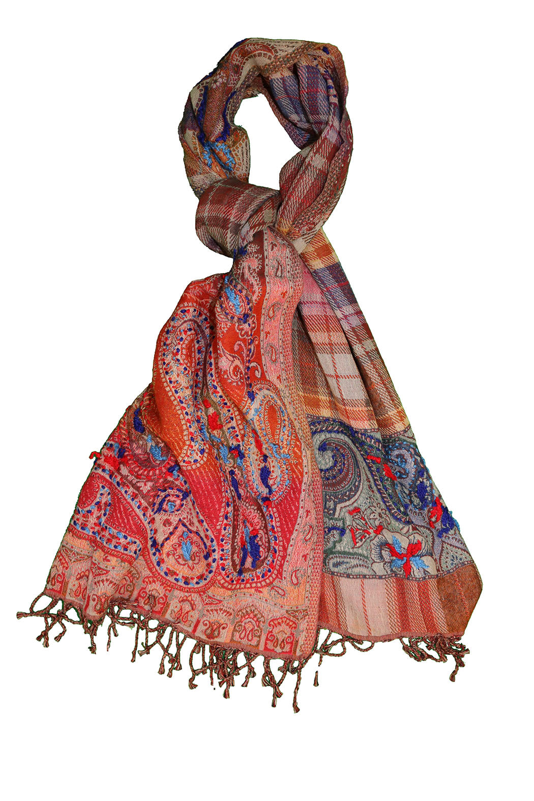 Elegant og farverigt uld tørklæde med broderinger, tørklædet er vævet af 100 % let kogt uld.