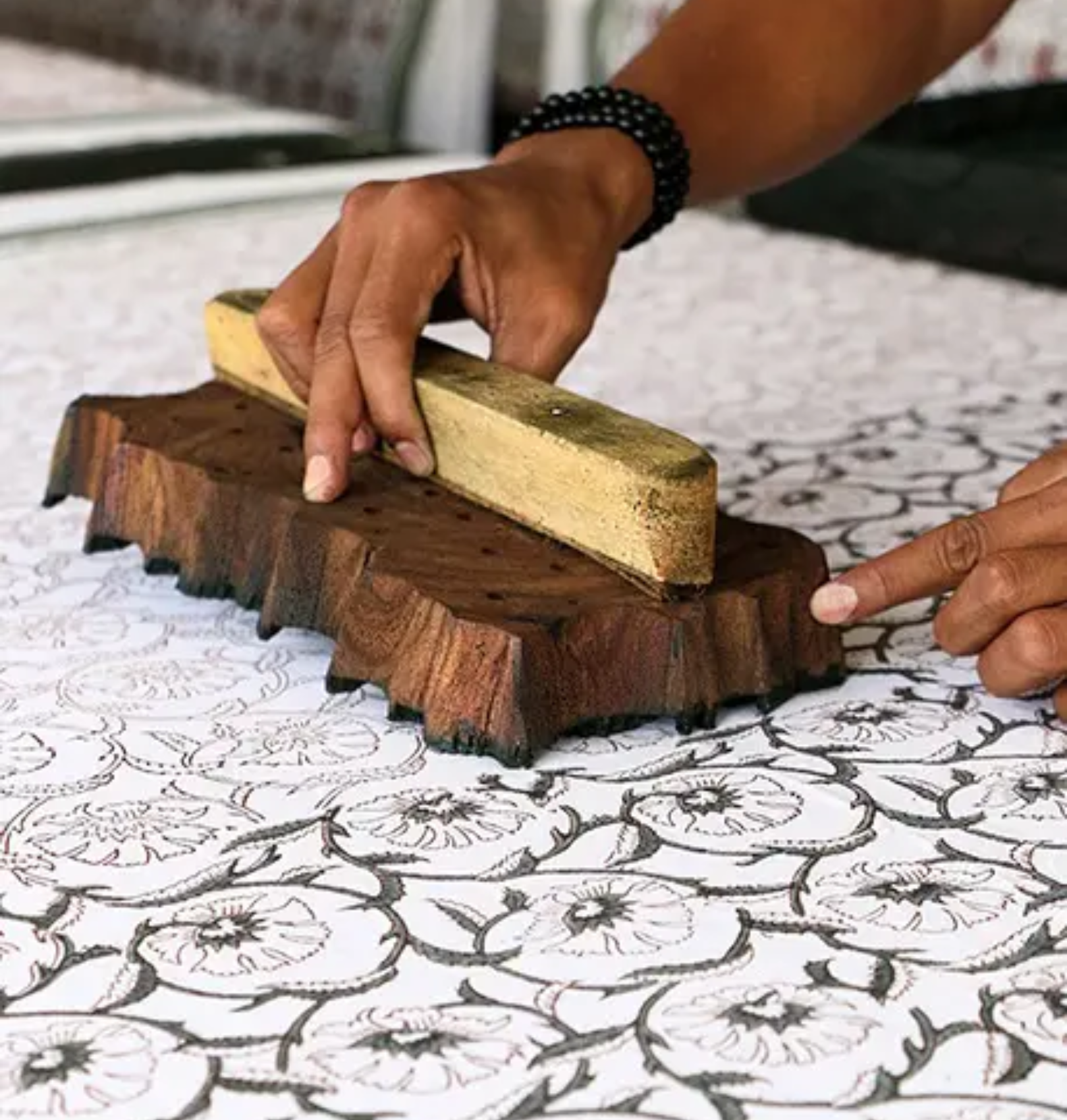 Blokprint en håndarbjds tradition der typisk praktiseres i Chhipa-samfundet i Bagru i delstaten Rajasthan ligeledes i Indien - processen med blokprint starter med håndskæring af træblokke, fortrinsvis palisander på grund af dets holdbarhed, og de skæres til mønstre og designs og dyppes derefter i farvestof og stemples på lange stykker bomuldsstof.